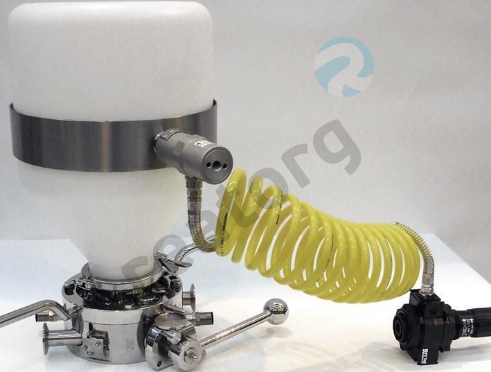 Съемный вибрационный зажим (с пневматическим приводом) устанавливается на контейнеры для облегчения разгрузки порошкообразного продукта, имеющего плохие характеристики сыпучести. Размер контейнера ChargeBottle: 10 л