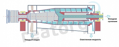 Разделение в декантерах происходит в горизонтальной чаше, оснащенной шнековым конвейером. Разделяемая среда подается через стационарный патрубок и плавно разгоняется в ускорительной камере. Центростремительные силы обеспечивают постоянное осаждение твердых частиц на стенках чаши. Шнековый конвейер вращается в том же направление, что и чаша, но с другой скоростью, проталкивая осажденные частицы к конической части чаши, где происходит их выгрузка. Декантеры работают в непрерывном режиме, с постоянным отводом твердого осадка и осветленной жидкости.