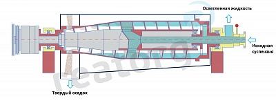 Разделение в декантерах происходит в горизонтальной чаше, оснащенной шнековым конвейером. Разделяемая среда подается через стационарный патрубок и плавно разгоняется в ускорительной камере. Центростремительные силы обеспечивают постоянное осаждение твердых частиц на стенках чаши. Шнековый конвейер вращается в том же направление, что и чаша, но с другой скоростью, проталкивая осажденные частицы к конической части чаши, где происходит их выгрузка. Декантеры работают в непрерывном режиме, с постоянным отводом твердого осадка и осветленной жидкости.