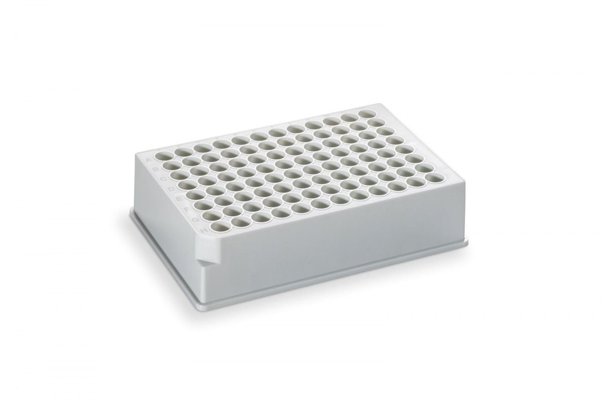 96-луночный микропланшет для хранения и анализа, белый, из полипропилена, круглая лунка объемом 1 мл, общий объем 96 мл, сферическое дно, высота 32 мм, глубина лунки 29,06 мм, 25 шт/уп.