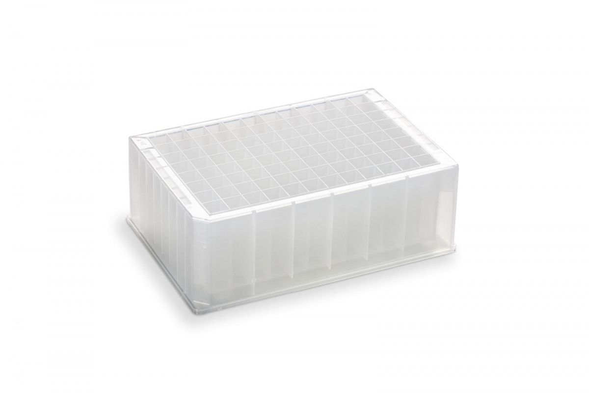 96-луночный микропланшет для хранения и анализа, из полипропилена сверхвысокой чистоты (СВЧПП), облученный, квадратная лунка объемом 2 мл, общий объем 192 мл, пирамидальная форма дна, высота 44,04 мм, глубина лунки 39,22 мм, 25 шт/уп. Предлагается крышка к данной планшете №202497-100. Планшеты стерилизованы гамма-излучением.