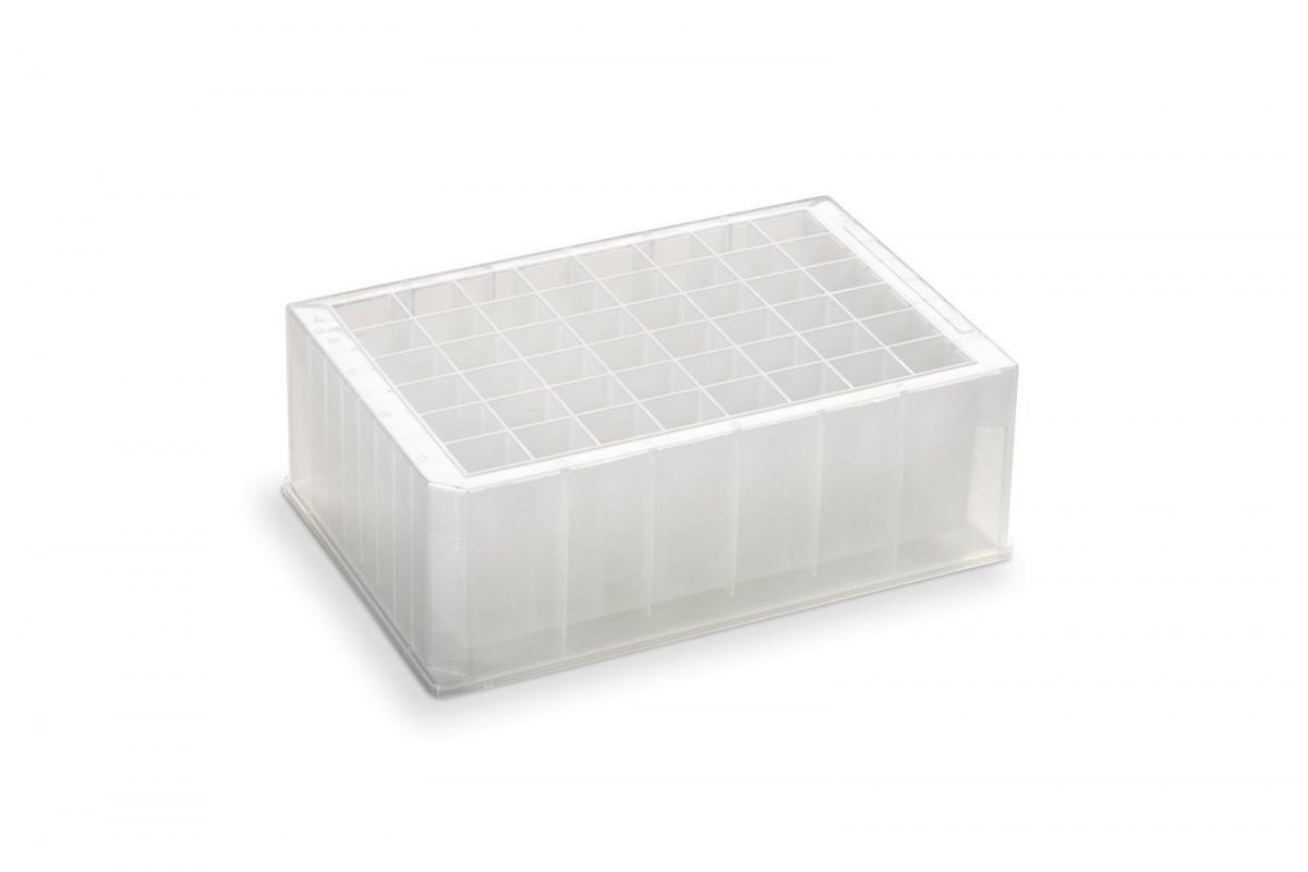 48-луночный микропланшет для хранения и анализа (6 рядов по 8 колонок), из полипропилена сверхвысокой чистоты (СВЧПП), прямоугольная лунка объемом 4,8 мл, общий объем 230,4 мл, пирамидальная форма дна, высота 44,04 мм, глубина лунки 42,08 мм, 25 шт/уп. Предлагается крышка к данной планшете №201156-100.