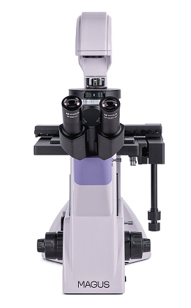 Микроскоп оснащен тринокулярной визуальной насадкой, которую при сборке микроскопа можно развернуть на 180°, чтобы адаптировать ее под необходимую высоту. Микроскоп оборудован двумя каналами визуализации: один вертикальный, расположен на корпусе и используется для установки монитора, второй встроен в корпус и нужен для установки цифровой камеры. Револьвер с 5 гнездами находится под исследуемым образцом. В комплекте четыре планахроматических объектива с расчетом на бесконечность: три из них предназначены для светлопольных наблюдений, один – для фазового контраста.