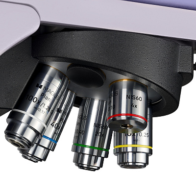 Моторизированный револьвер на 6 объективов, направлен «от наблюдателя» к штативу: пользователь видит объектив, который ввел в ход лучей, пространство над столиком свободно. В свободное гнездо револьвера можно установить дополнительный объектив, который позволит получить еще одно увеличение внутри диапазона кратности. Объективы планахроматические, парфокальная высота – 60 мм.