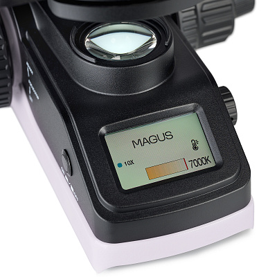 Еще одно важное добавление к конструкции микроскопа – ЖК-экран. На нем можно отслеживать выбранные параметры освещения (яркость и цветовую температуру), увеличение объектива, режим работы (спящий или эко), а также выставить таймер на автоотключение устройства.