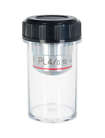 Объектив с увеличением 4 крата и пределом разрешения 2,75 мкм. Ориентирован на тубус с длиной «бесконечность», парфокальная высота 45 мм. Рассчитан для работы с образцами как с покровным стеклом, так и без него. Так как рабочее расстояние составляет 21 мм объектив может использоваться и на инвертированных микроскопах для изучения образцов в лабораторной посуде, толщина дна которой составляет 1,2 мм.