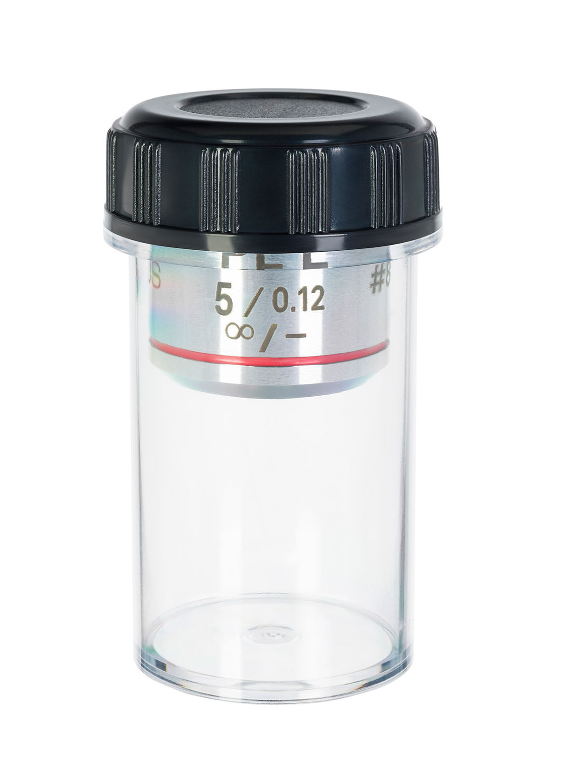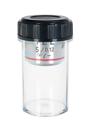 Объектив различает две точки на препарате на минимальном расстоянии 2,29 мкм. Обладает увеличением 5х и в системе с окулярами от 10х до 25х создает полезное увеличение микроскопа 60–120х. Рассчитан на тубус «бесконечность», парфокальная высота – по стандарту DIN (45 мм). Для работы с этим объективом препарат накрывается покровным стеклом толщиной 0,17 мм.