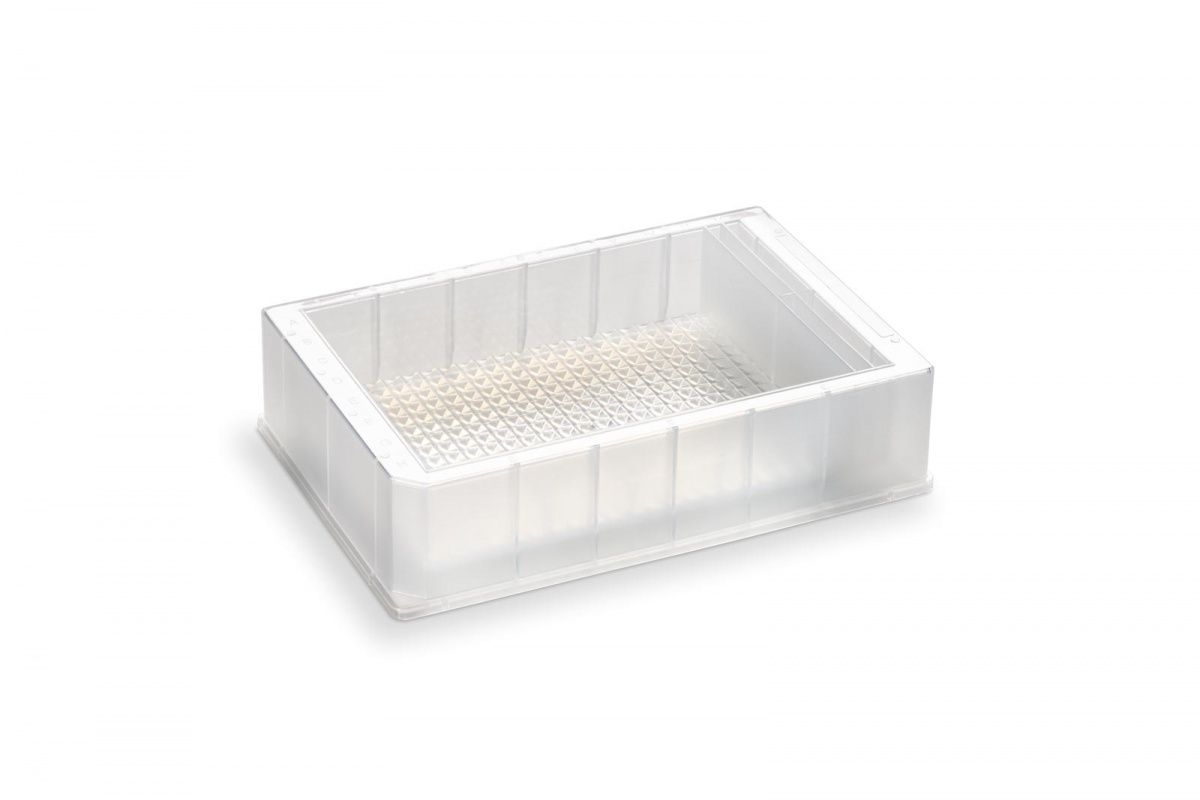 Резервуар из полипропилена с 5 уникальными полостями, 4 контрольных лунки по 2,6 мл каждая, основная лунка 145 мл, общий объем 165,4 мл, форма дна из 384 пирамид, высота 30,6 мм, 25 шт/уп.