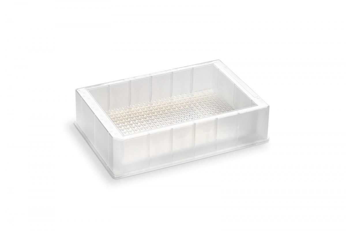 Резервуар с одной полостью из полипропилена, объем 170 мл, форма дна из 384 пирамид, высота 30,6 мм, облученный, 25 шт/уп. Планшеты стерилизованы гамма-излучением.
