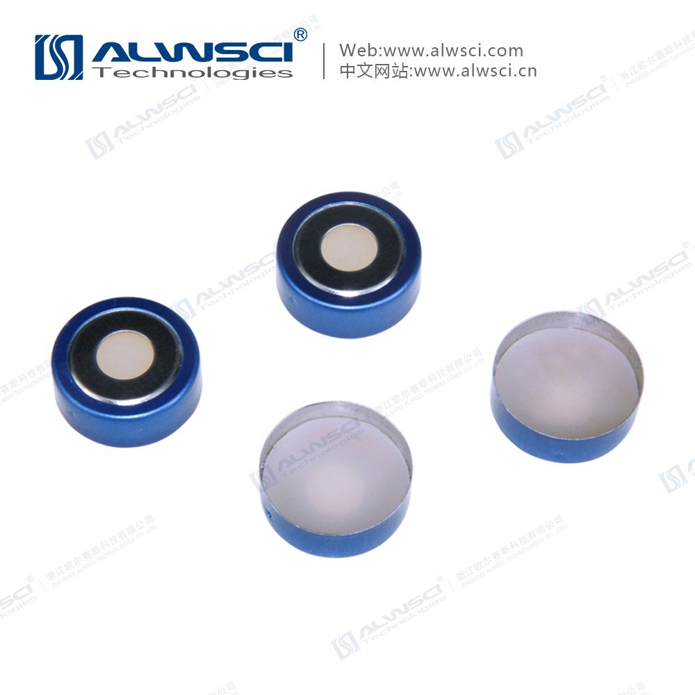 Лабораторные расходные материалы: Крышки обжимные, синие, с открытым верхом, диаметр крышки 20 мм, диаметр отверствия 8 мм, материал - биметалл, септа ПТФ/силикон толщиной 3 мм, 100 шт/уп