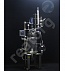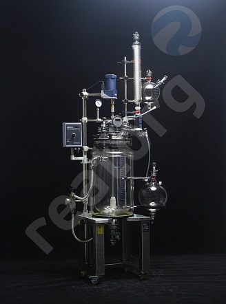 Стеклянный реактор объемом 10 л из боросиликатного стекла марки 3.3 с приварной рубашкой объемом 6 л, со съемной купольной крышкой, с донным вентилем 20 мм, с центральной верхнеприводной мешалкой, мерником 0,5 л, теплообменником, на монтажной раме.