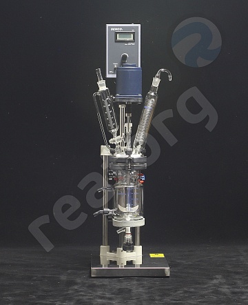 Стеклянный реактор объемом 1 л из боросиликатного стекла марки 3.3 с приварной рубашкой объемом 6 л, со съемной купольной крышкой, с донным вентилем 8 мм, с центральной верхнеприводной мешалкой, мерником 0,1 л, теплообменником, на штативе.