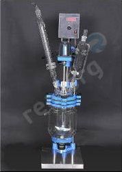 Стеклянный реактор объемом 2 л из боросиликатного стекла марки 3.3 с приварной рубашкой объемом 6 л, со съемной купольной крышкой, с донным вентилем 8 мм, с центральной верхнеприводной мешалкой, мерником 0,25 л, теплообменником, на штативе.