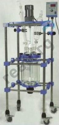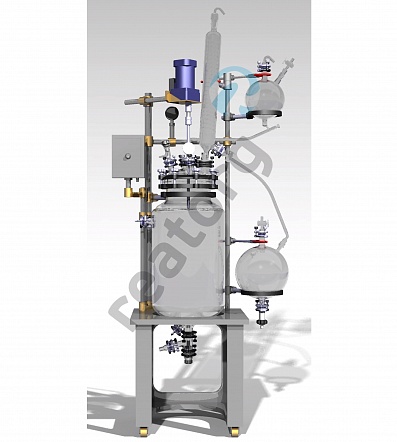 Стеклянный реактор объемом 10 л из боросиликатного стекла марки 3.3 с приварной рубашкой объемом 6 л, со съемной купольной крышкой, с донным вентилем 20 мм, с центральной верхнеприводной мешалкой, мерником 0,5 л, теплообменником, на монтажной раме.
