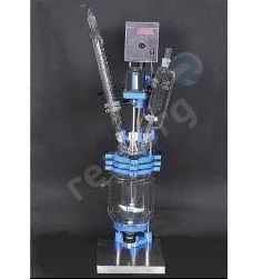 Стеклянный реактор объемом 3 л из боросиликатного стекла марки 3.3 с приварной рубашкой без теплоизоляции, со съемной купольной крышкой, с донным вентилем 38 мм, с центральной верхнеприводной мешалкой, мерником 0,25 л, теплообменником, на штативе.