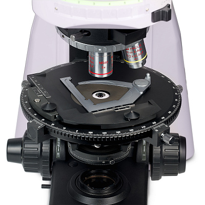 Регулируемая полевая диафрагма, центрируемый и регулируемый по высоте конденсор с оптикой без напряжений, регулируемой апертурной диафрагмой и откидной линзой реализуют настройку освещения по Кёлеру. Откидную линзу выводят из хода лучей для объективов с малым увеличением и возвращают обратно для объективов увеличением больше, чем 10 крат. Поляризатор вращается в диапазоне 0–360°, на шкале нанесены отметки четырех углов поворота 0°, 90°, 180°, 270° относительно анализатора. Анализатор вращается на 360°, нониусная шкала анализатора для точности выставления угла.