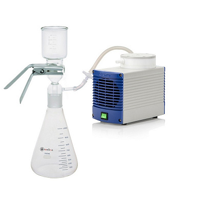 Компактная портативная система вакуумной фильтрации VF214 сочетает в себе: мощный и химически стойкий безмасляный вакуумный насос, оснащенный вакууметром и ручным регулятором вакуума, и стеклянным фильтрующим комплектом VF3.