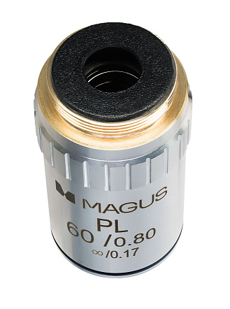 С объективом MAGUS MP60 60х/0,80 Plan ∞/0,17 рекомендуется использовать окуляры с кратностью от 7x до 14x. Оптимальная толщина покровного стекла – 0,17 мм.