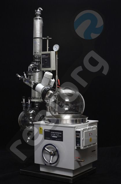 Ротационный испаритель на 20л с водяной баней мощностью 3,6кВт, регулируемый диапазон температур от 0°С до 99°С, приемная колба 10л с донным сливом. Оборудован вертикальным холодильником. Взрывозащищенное исполнение.