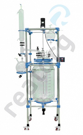 Стеклянный реактор объемом 100 л из боросиликатного стекла марки 3.3 с рубашкой и съемной крышкой.