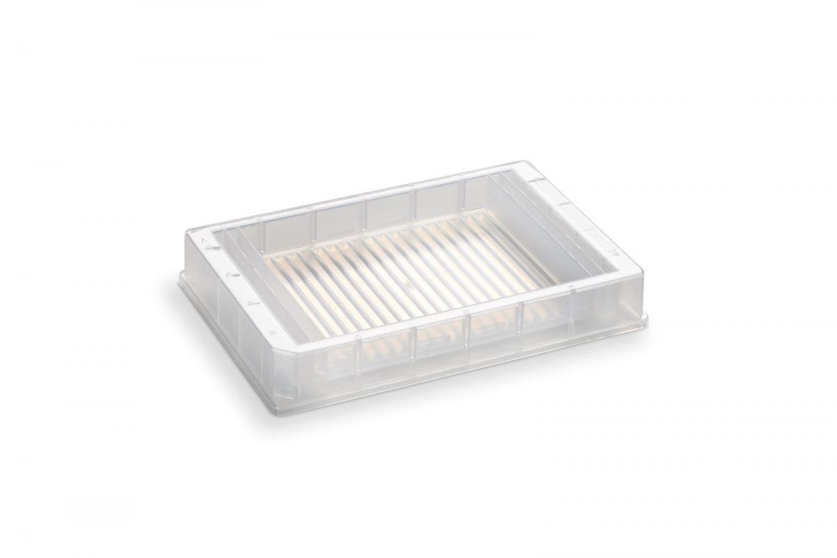 Резервуар из полипропилена с 5 уникальними полостями, 4 контрольные лунки по 3,25 мл каждая, основная лунка 86,3 мл, максимальный объем 92,3 мл, форма дна из 24 пирамид, высота 19 мм, 25 шт/уп.