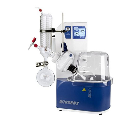 Ротационный испаритель на 1л или 2л с водяной баней мощностью 1,5кВт, регулируемый диапазон температур от 0°С до 99°С, приемная колба 1л с донным сливом. Оборудован вертикальным холодильником.