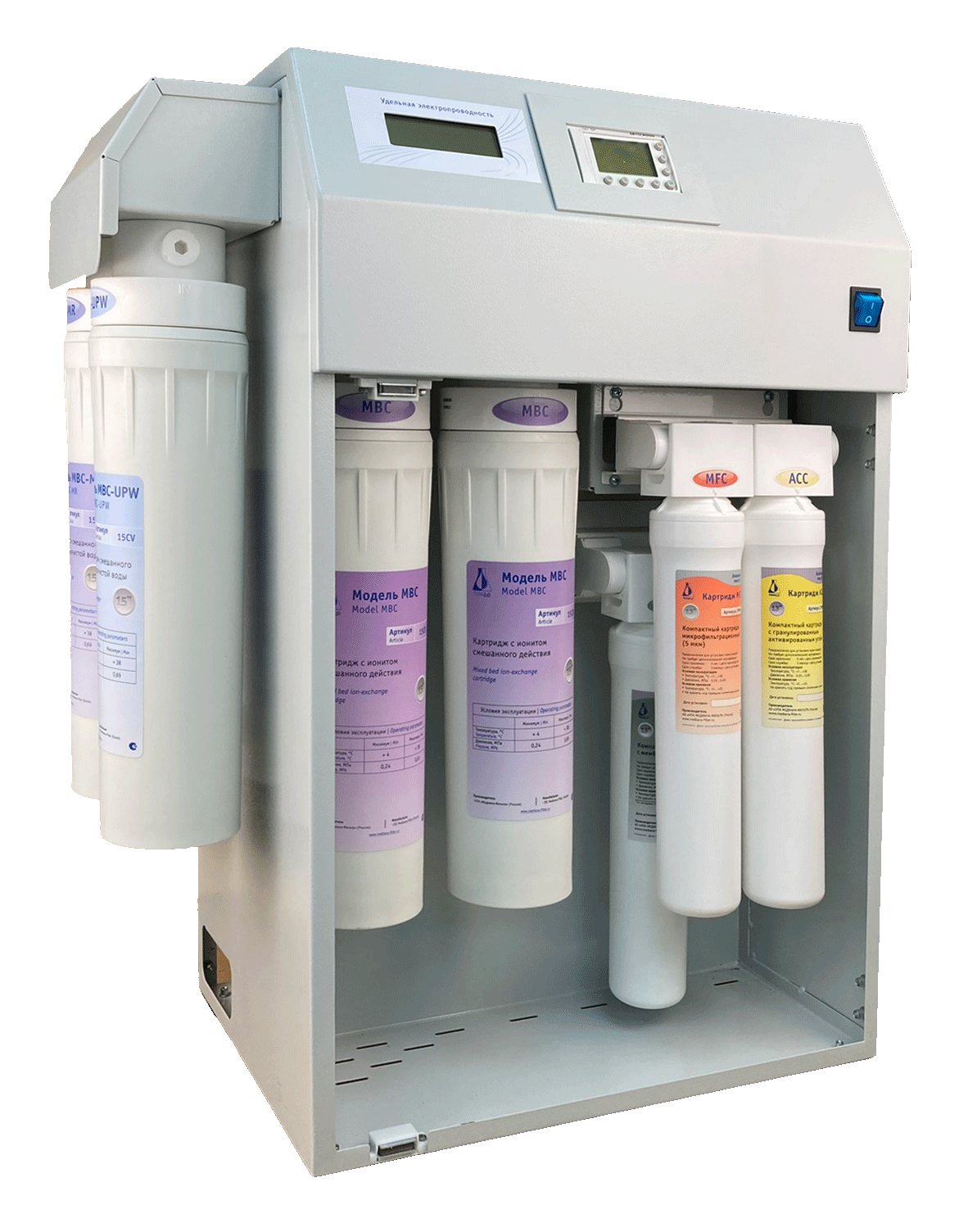 Назначение: Получение воды степени чистоты 1 и 2 по ГОСТ 52501-2005 «Вода для лабораторного анализа», степени чистоты 1, 2 и 3 по ISO 3696:1987, воды CLRW по CLSI, а также воды, удовлетворяющей требованиям ГОСТ Р 58144-2018 Вода дистиллированная, ФС.2.2.0020.15 «Вода очищенная», ФС.2.2.0019.15 «Вода для инъекций» и другим стандартам для ультрачистой воды.