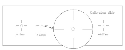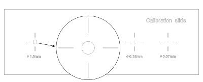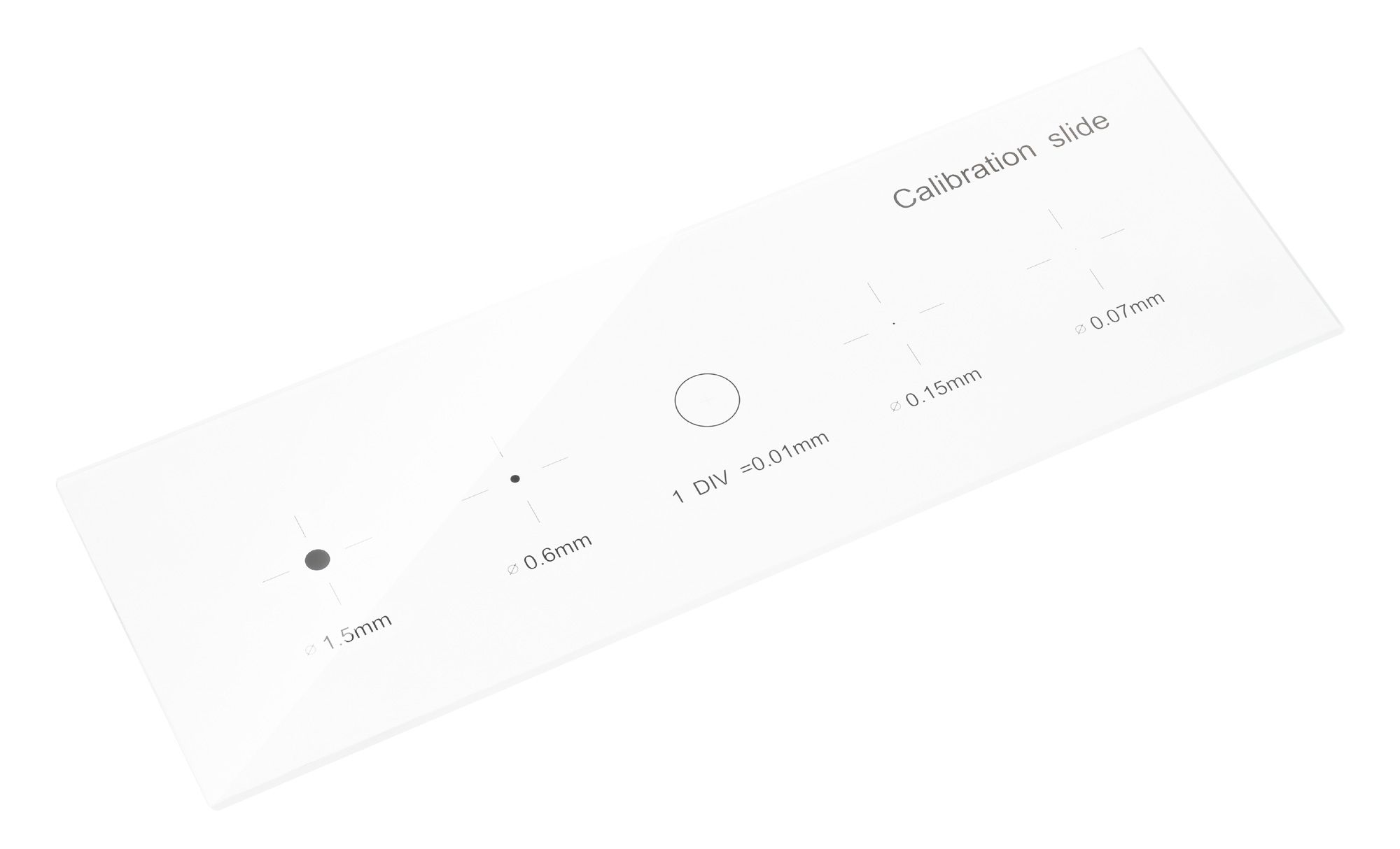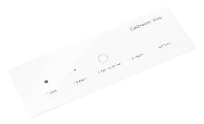 Калибровочный слайд MAGUS CS5 (XY0,01/0,07/0,15/0,6/1,5) по своим размерам соответствует стандартному предметному стеклу. Материалом изготовления послужило оптическое стекло. На слайд нанесены окружности, диаметр которых составляет 0,07 мм, 0,15 мм, 0,6 мм и 1,5 мм, есть также горизонтальная и вертикальная микрометрические шкалы на 100 делений. Цена одного деления – 0,01 мм.