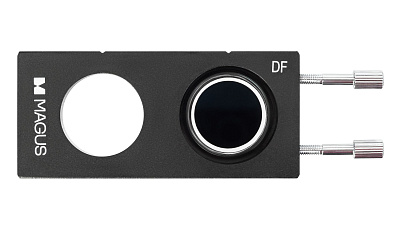 Слайдер для исследований прозрачных объектов методом темного поля, без их окрашивания. Представляет собой вставку в конденсор Аббе. Кроме встроенной диафрагмы слайдер имеет свободное отверстие для быстрого переключения на метод светлого поля. Слайдер MAGUS DFS1 – удобная замена обычному темнопольному конденсору, для установки которого надо снимать с микроскопа конденсор Аббе.