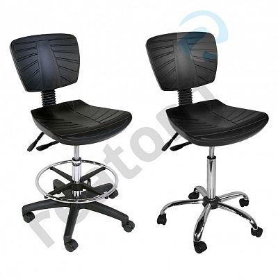 Материал сиденья и спинки лабораторного стула GEMA - мягкий литой полиуретан черного цвета, позволяющий работать в условиях больших знакопеременных нагрузок и температур.